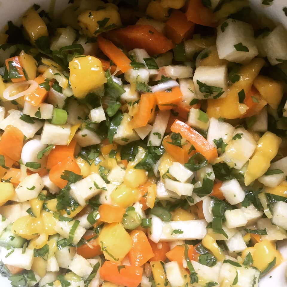 I can eat this all day-it’s great with chicken or fish as a “salsa” but also can be a side salad! A little sweet and crunchy with just the right amount of tangy spiciness!